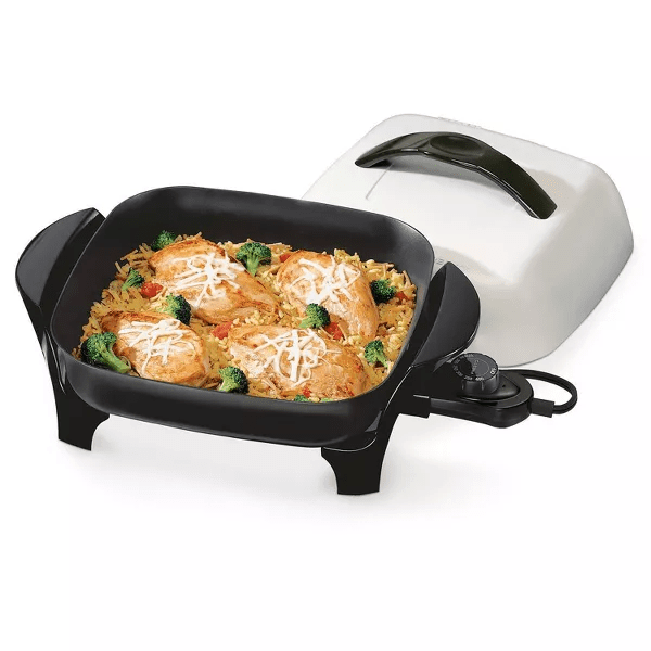 Handy for every meal and entertaining.Roasts, fries, grills, stews, bakes, makes casseroles and more.High-dome cover and high-sidewall pan offer greater food capacity.Nonstick surface, inside and out, for stick-free cooking and easy cleaning.Durable EverNu™ cover won't dent, warp, peel, or bend.Control Master® heat control maintains desired cooking temperature.More efficient to use than a range burner or oven.Heavy cast aluminum base is virtually warp-proof.Fully immersible and dishwasher safe with the heat control removed.