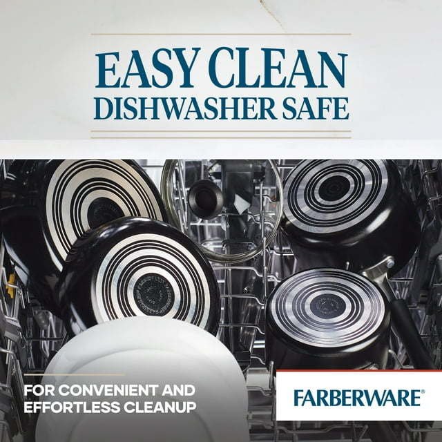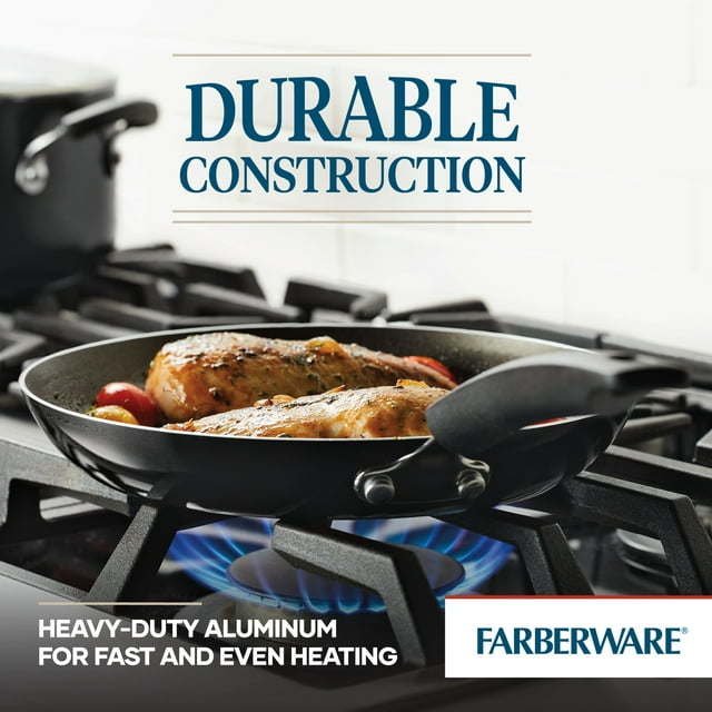 Farberware 3-Piece Easy Clean Aluminum Non-Stick Frying Pan/ Fry Pan/Skillet Set, Black: Durable dishwasher-safe nonstick skillet triple pack includes 8-inch, 9.75-inch, and 12-inch skillets The aluminum construction heats quickly and evenly, reducing hot spots that burn foods Sturdy, double riveted handles are contoured for a comfortable hold in the hand This cookware is oven safe to 350 degrees F