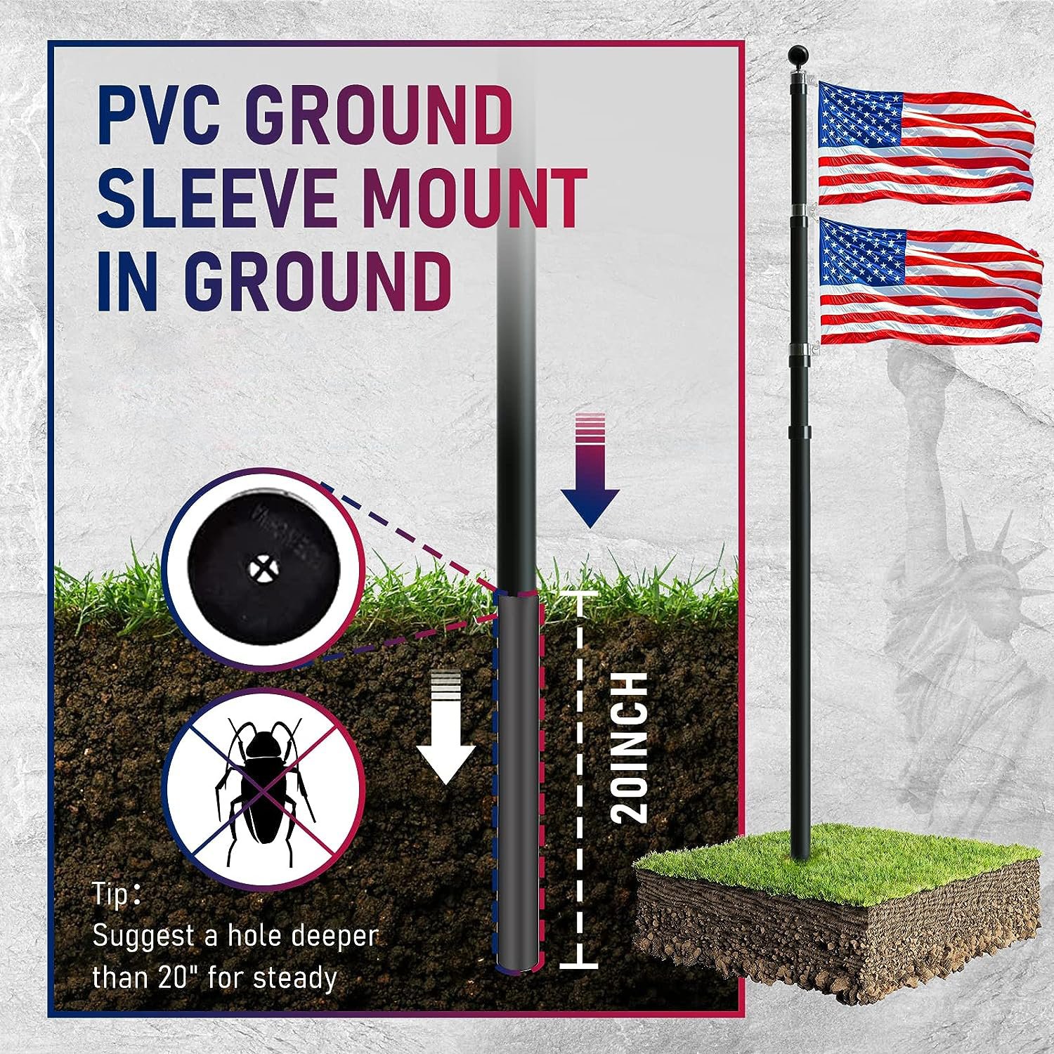 5.All components: 30 foot aluminum telescopic flag 6 knots 1 golden ball 4 aluminum buckles 1 PVC pipe One American flag specification Reinforced 3 corrugated boxes