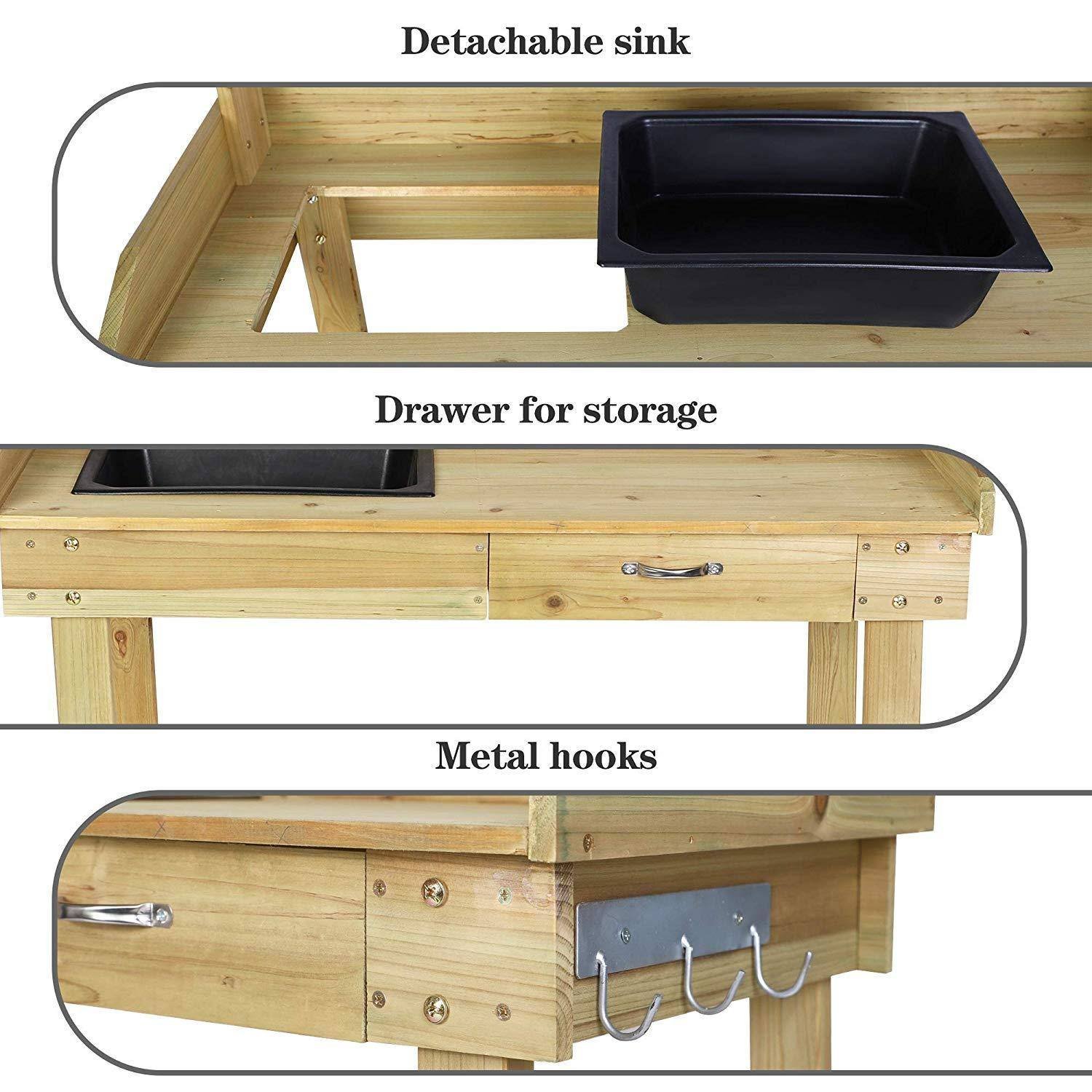 Stylish Gardening Table: Wooden potting benches help keep your garden area clean and organized; Nice-look will fit nicely in your backyard; patio. And it will be a great assistant for your gardening tasks.Sturdy & Durable: Made of natural solid fir wood; 0.6'' thickness board provide great support to hold flower pot; As for gardening tools; it can be used for a long time.Spacious Storage Spac: Dimension: 36" L x 18" W x 47" H; This garden work table constructed with side hooks; drawer; tabletop shelf; and open shelf; Provide enough place to hold your gardening tools.Easy Set-Up: Every part of the plant potting table is clear; you can follow the instruction to assemble it; if there any assemble problem; please feel free to contact us.Muti-Use: Weight: 28.4 lbs; The sink is removable; convenient to clean the soil; It would make a good craft bench; potting bench; coffee bar; or outdoor bar station for a patio.