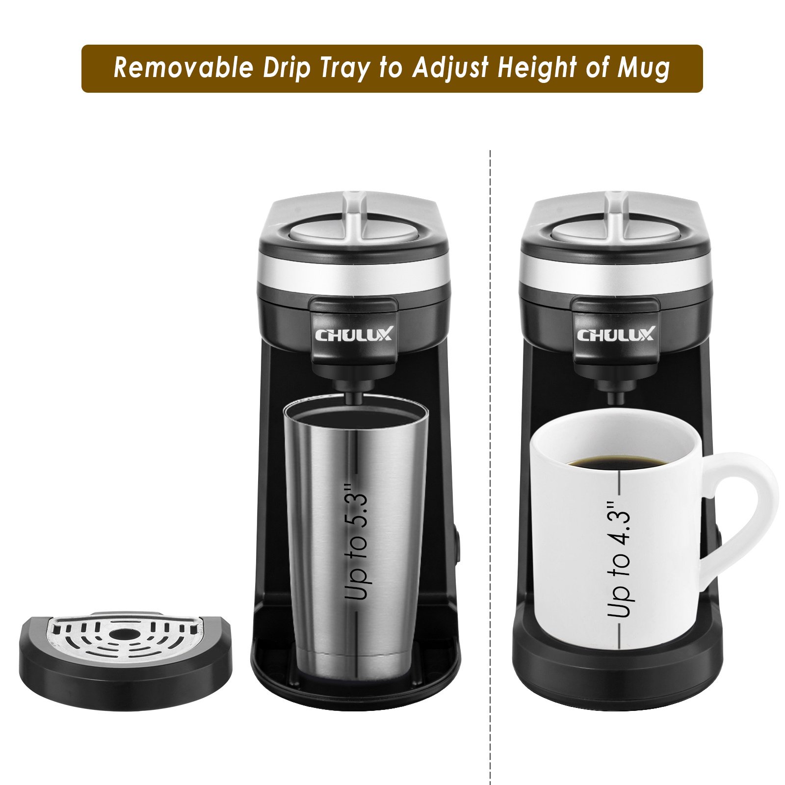 4, (MUG SIZES COMPATIBLE)The coffee flows out is almost same as the water amount you poured in,ensure every fresh coffee by maximize utilization.The single coffee brewer supports for travel mugs up to 5.3’’ tall by removing drip tray.