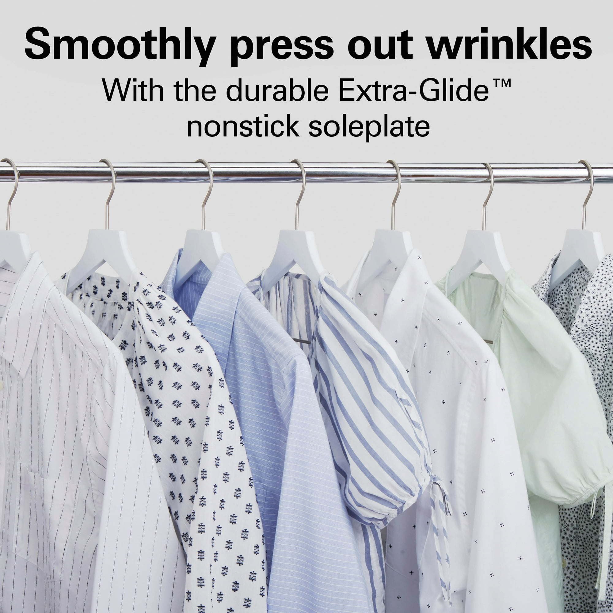 SMOOTHLY PRESS OUT WRINKLES: The durable Extra-Glide™ nonstick soleplate on this steam iron for clothes smoothly glides across fabrics to press out wrinkles.