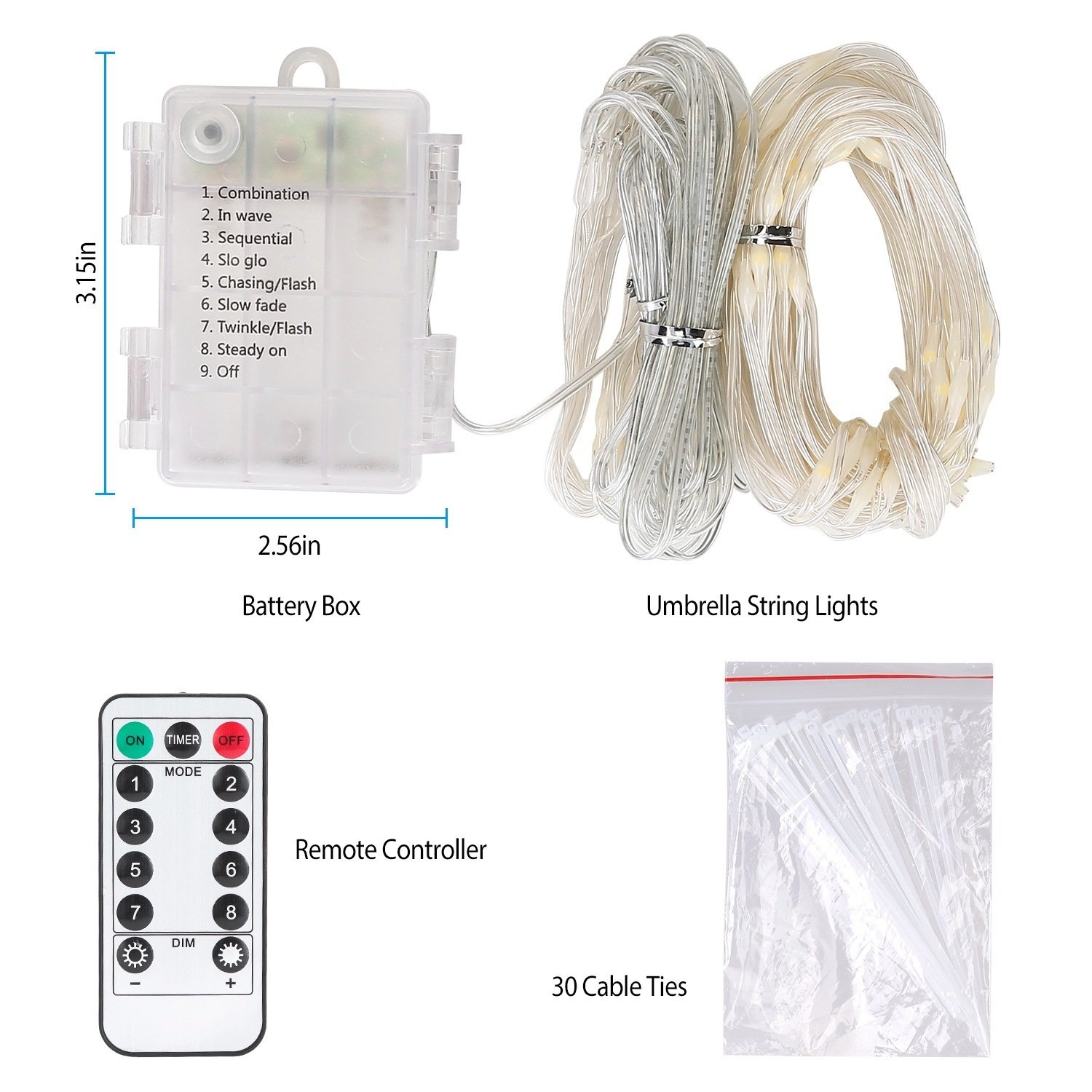 *8 Brightness Modes*:Gorgeous lighting modes including combination; wave; sequential; fading slowly; slow-glow; chasing; twinkle and steady on. Suitable for decorating umbrella or tents with 8 ribs. Ideal for decorating your patio; garden; deck; backyard; pool; gate; yard; party etc; also can be used as decorative string lights for cafe; bar; Christmas tree and other places.(Note:Umbrella not included)