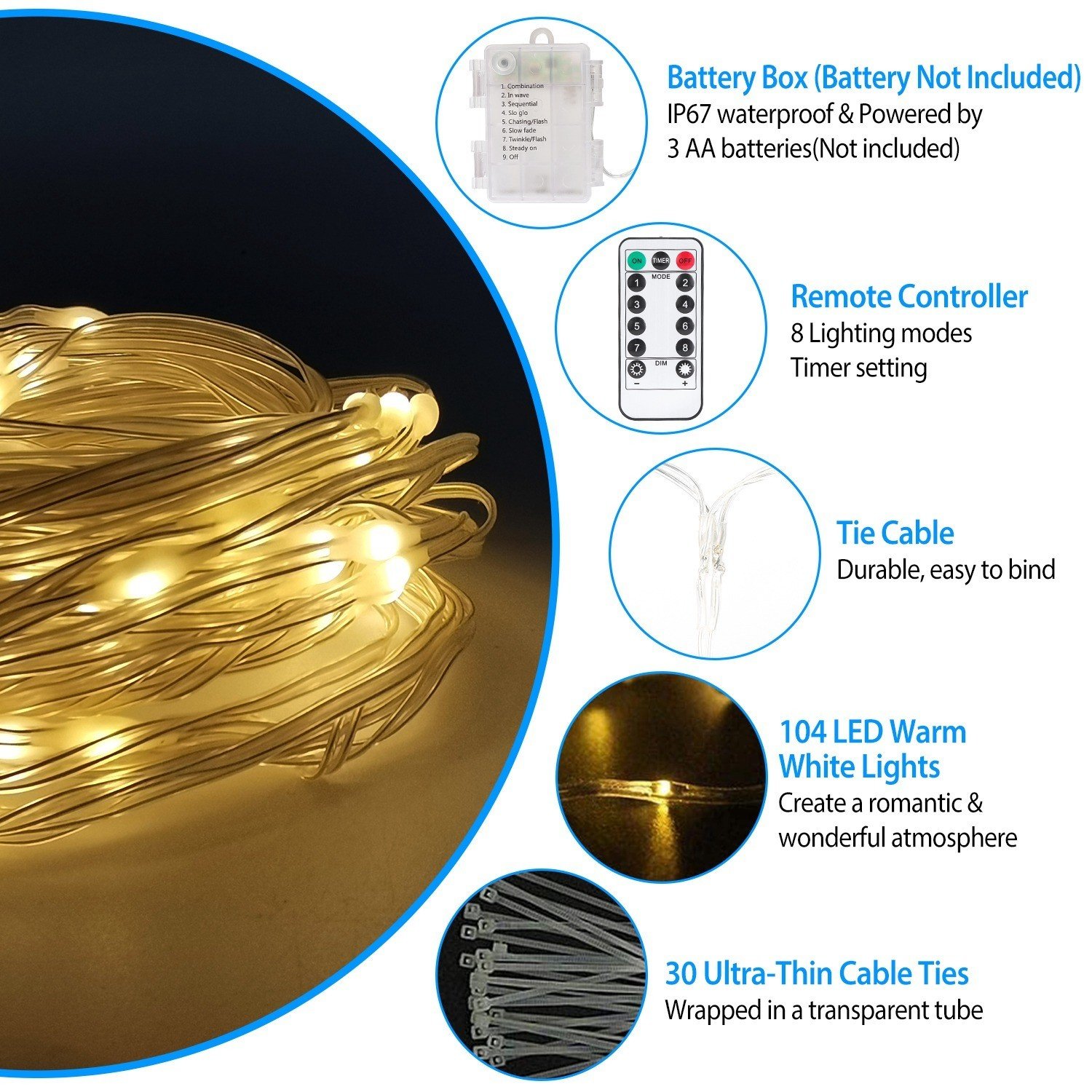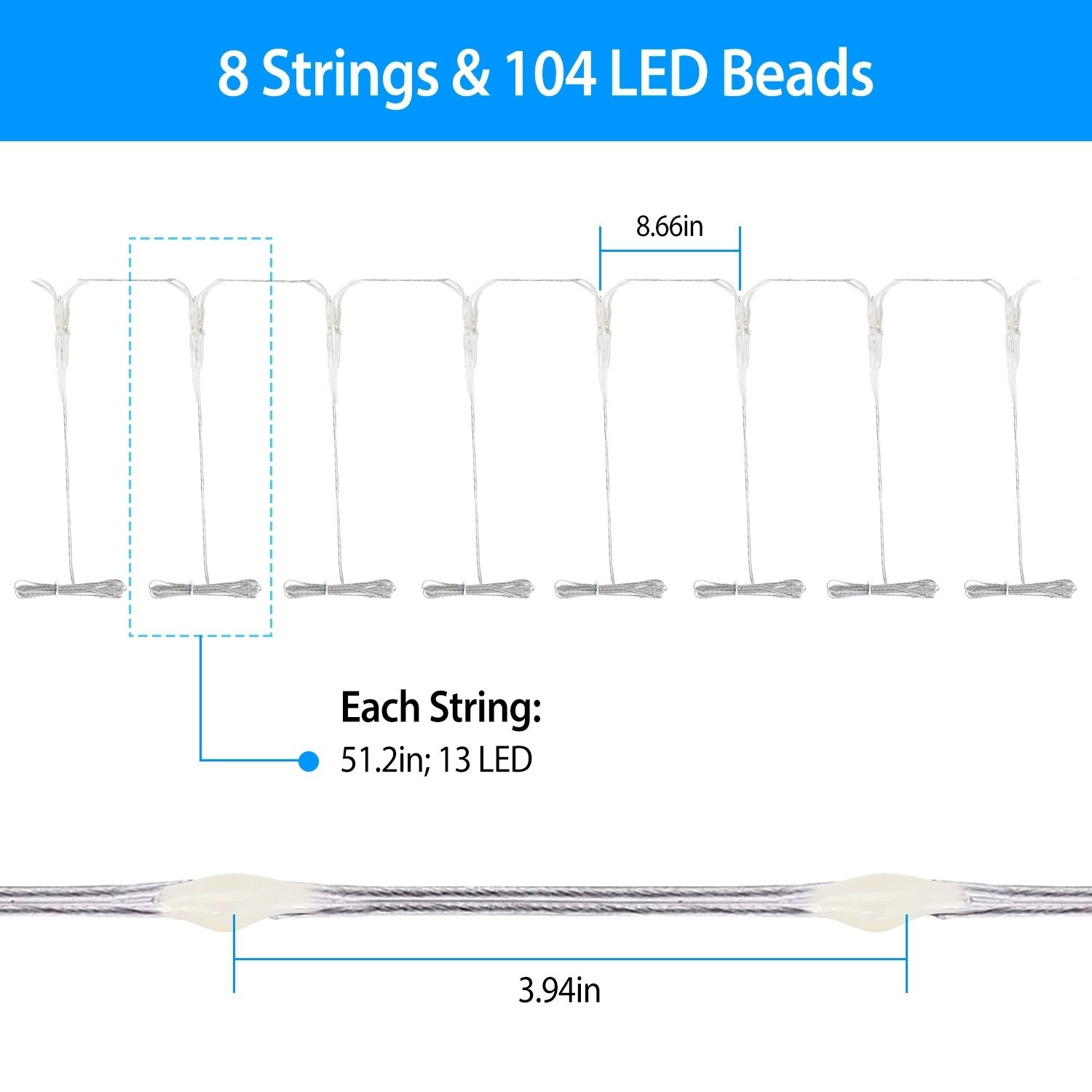 *IP65 Waterproof*:104 LED lights and 8 strings; 13 LED lights per string. Each string; designed with super soft copper wire; can be moderately bent to any shape; having a long service time. The waterproof level of the battery box reaches IP67. It is protected from water and dust; suitable for varieties of weather.